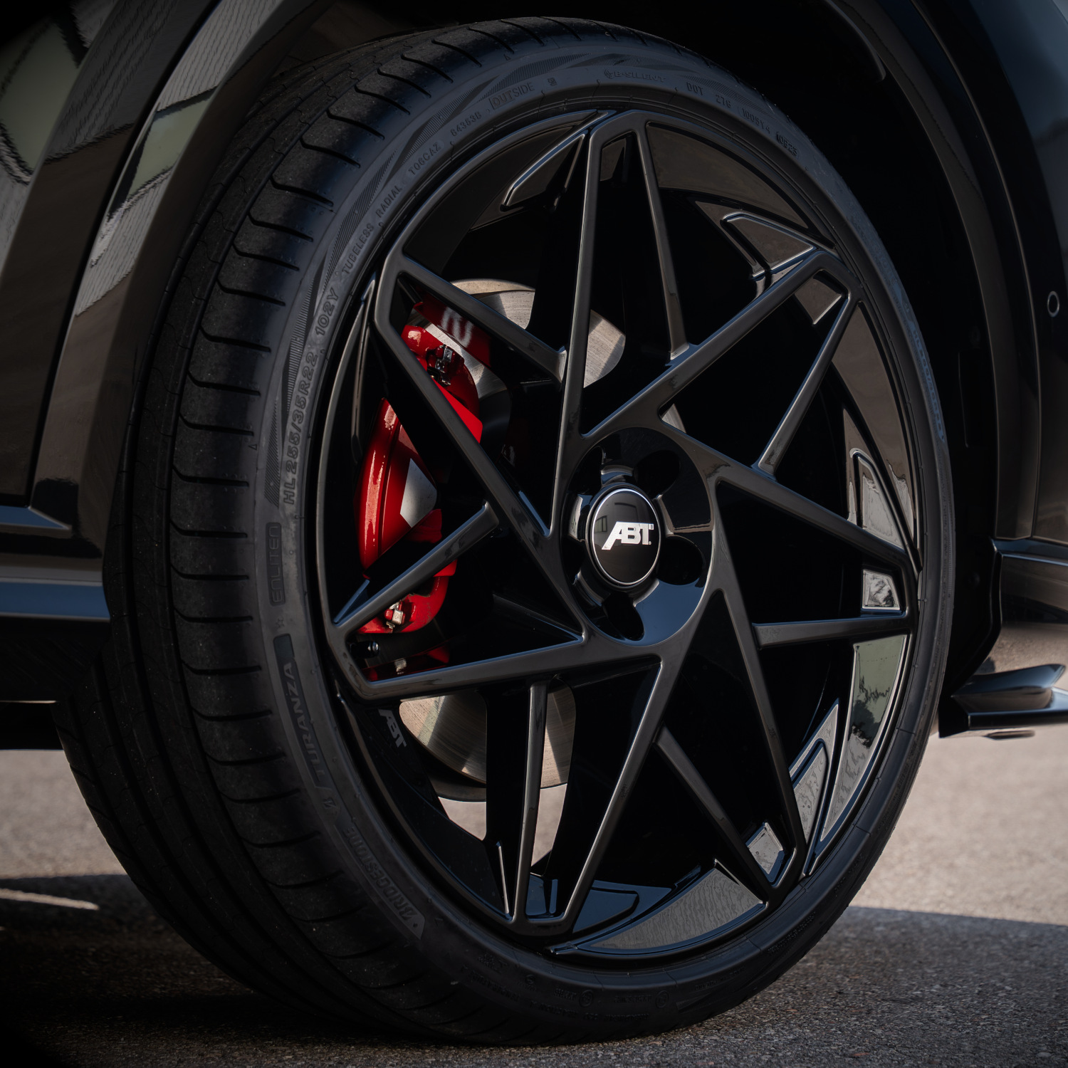 Ein zentrales Design- und Performanceelement sind die 22 Zoll großen ABT EVO Sportfelgen in glossy black mit Bereifung in 255/35 ZR22. Sie füllen die Radhäuser kraftvoll aus, verstärken die sportliche Anmutung und tragen dank ihrer leichten Konstruktion zu einem präzisen, direkten Fahrverhalten bei. Das Zusammenspiel aus Tieferlegung, großformatigen Felgen und Aerodynamik-Upgrade macht den SQ5 zu einem SUV mit deutlich geschärfter, dynamischer Präsenz.