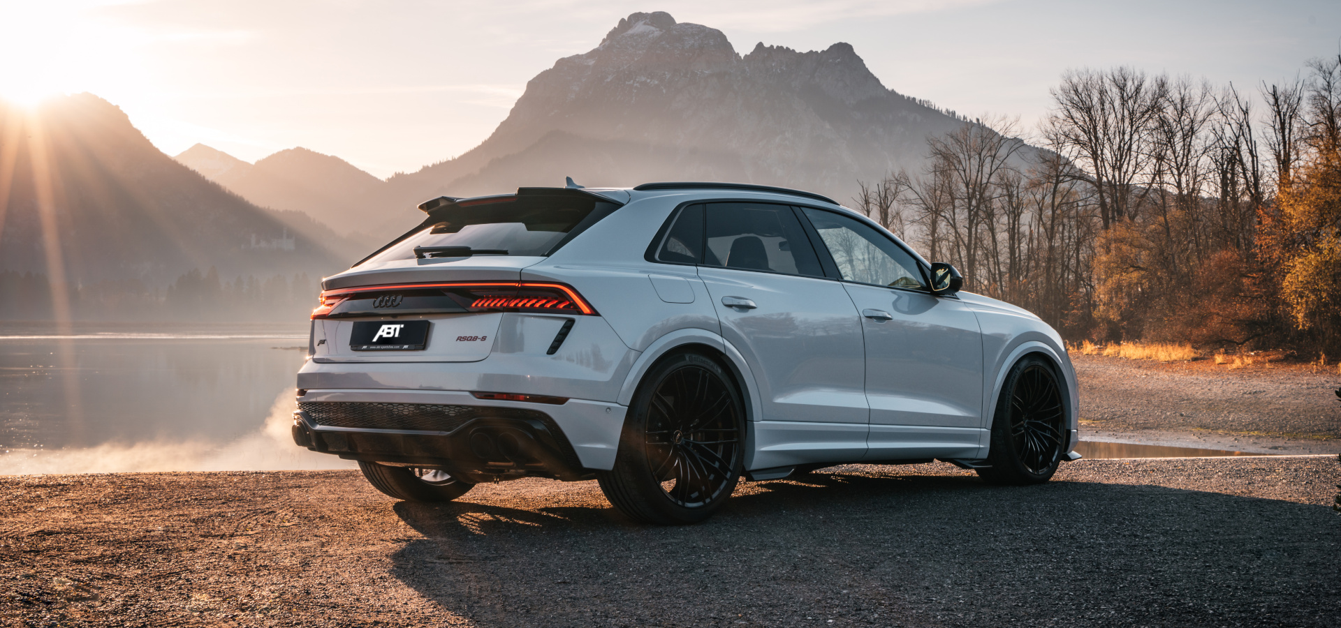 Auch optisch lässt der RSQ8-S die Muskeln spielen. Das umfangreiche Aeropaket mit ABT Frontlippe, Seitenschwelleraufsätzen und ABT Heckspoiler in sportlich glänzendem Sichtcarbon lassen das SUV erstrahlen. Zusätzlich unterstreichen die ABT Schalldämpferanlage aus Edelstahl mit ihren vier 102-mm-Endrohrblenden sowie das ABT Level Control mit seinen verschiedenen Tieferlegungsstufen bis zu 25 mm an der Vorder- und Hinterachse die Power des RSQ8-S.