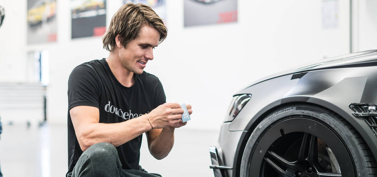 Angesichts der coolen Folierung sollte man aber natürlich die zahlreichen Anbauteile von ABT nicht vergessen, die größtenteils in Sichtcarbon ausgeführt sind: Verbaut wurden Frontlippe, Frontschürzenaufsätze, Spiegelkappen, Radhausentlüftungen, Seitenschweller- und Heckschürzenaufsätze sowie ein Heckspoiler. Getönte Front-, Heck- und Seitenscheiben sowie abgedunkelte Scheinwerfergläser machen den „Olsson-Look“ komplett – zumindest fast. Mit dem ersten Prototyp des ABT Aerorads, das speziell für den Schweden auf Basis der mattschwarzen ABT FR Felge aufgebaut wurde, wartet noch ein weiterer Eyecatcher auf den Betrachter.